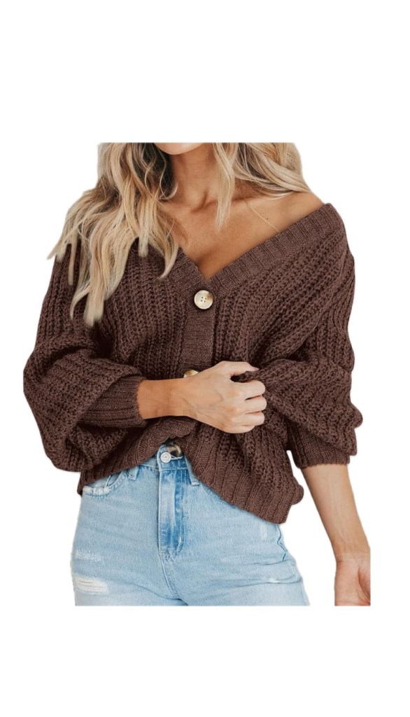 Want something a little more causal and everyday? I personally own this Brown Chunky Knit Button Cardigan by PRETTYGARDEN from Amazon. This cardigan is slightly cropped with a loose fit looks great with jeans. I’ve worn it both opened and buttoned up, but my new favorite way is to drape it over my shoulders. This is a great buy and comes in so many different colors.