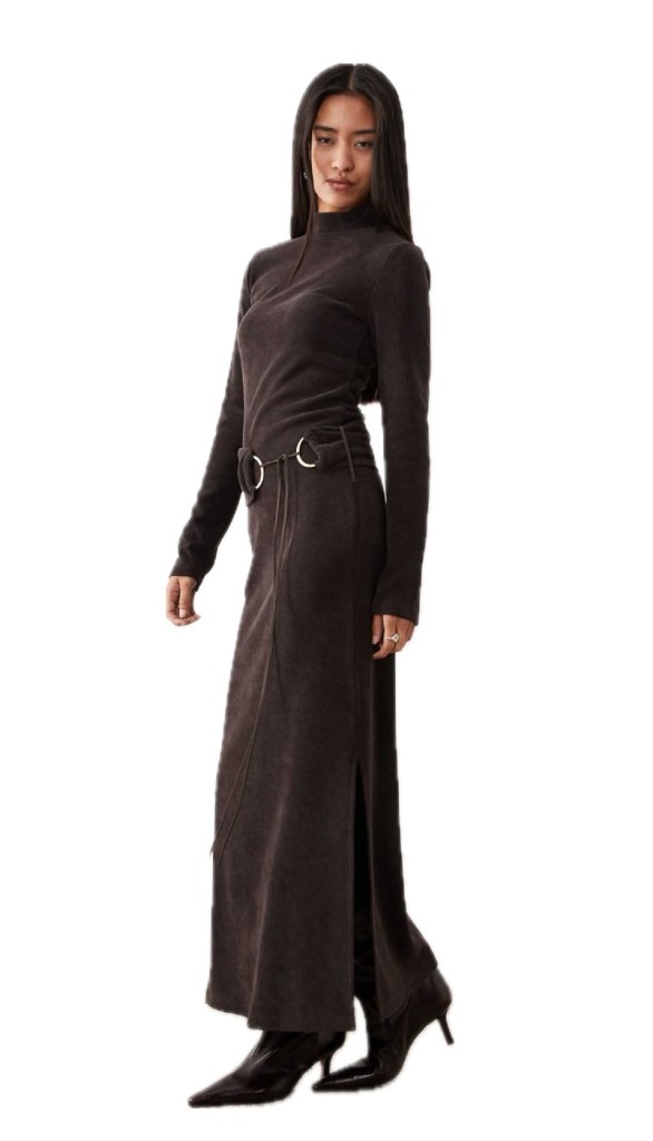 Ok this next look is a whole vibe. This ASOS DESIGN high neck cord midi dress with hardware in chocolate would be perfect for Thanksgiving or if you have a holiday or Fall photoshoot coming up. I really love the hardware details that is reminiscent of the early 2000s. I had a belt just like this!