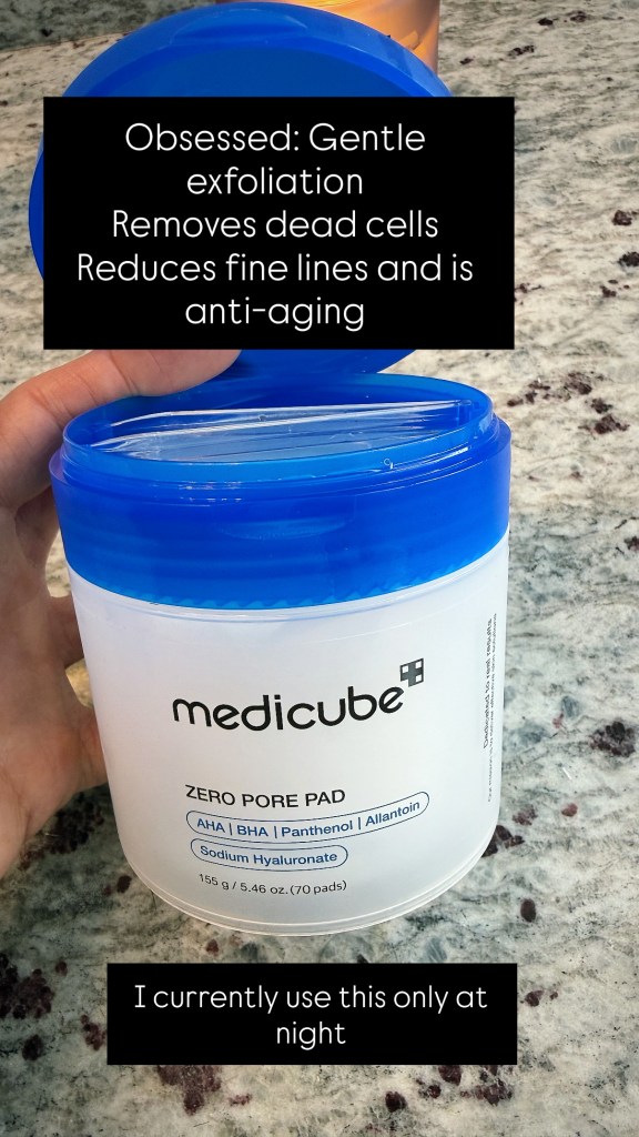 I had been looking for something to gently exfoliate my skin. I tried some glycolic pads a few months back that were way too strong and stripped my skin and left me dry and broken out. I INSTANTLY fell in love Medicube’s Zero Pore Pad and how this makes my skin feel. Not to mention, it has a ton of good reviews. I had to try it myself and I really like it. I currently only use it at night. Also note the cute tweezers it comes with to retrieve the pad.