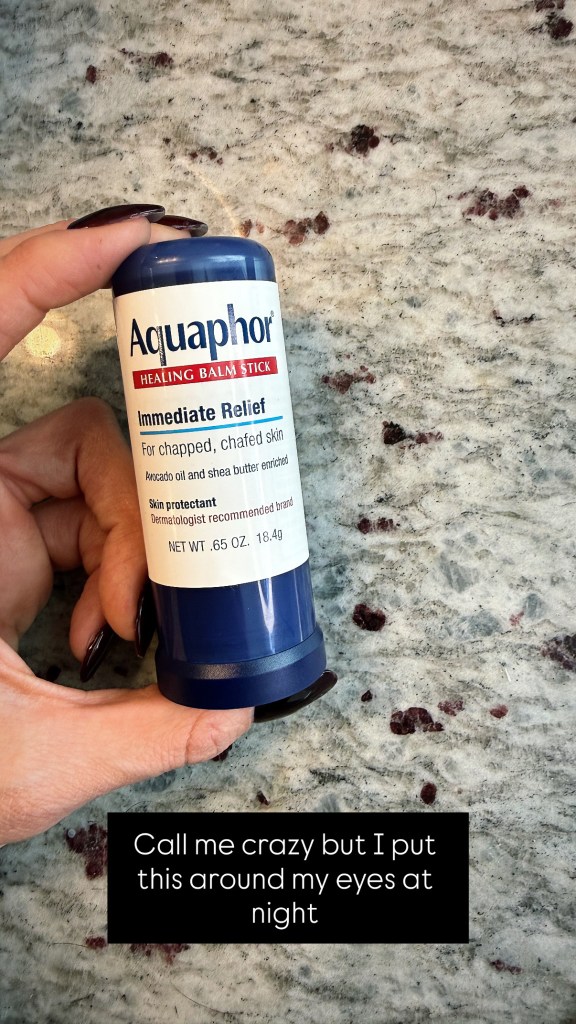 There are a few eye creams I like but most of them give me or enhance dark circles under my eyes. I decided to give them a break (I will circle back around and find one I like again), but in the meantime I started to use the Aquaphor Healing Balm Stick. This might sound crazy, but I’ve met women from my grandmother’s generation that SWORE by using vaseline to keep wrinkles away. Maybe they are on to something. Either way Aquaphor is ultra healing and I’ve used in the past after intense chemical peels, so my thought process is why not use this in the winter. Don’t cancel me over this…