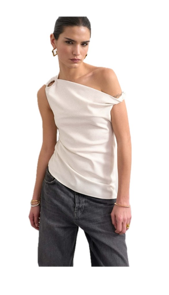 Asymmetrical- When I think of Asymmetrical last being big in fashion, I think of the mid 2000s when celebrities were walking the red carpet with an asymmetrical dress over jeans. However this time around there are so many variations that can be much more elevated than how we styled it in the 2000s. I found this ASOS Topshop twisted shoulder linen mix asymmetric top in ecru. Style this over a mini skirt or slacks.